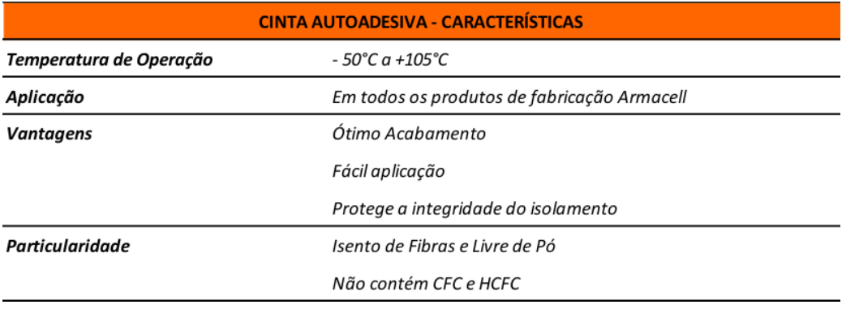 Cinta autoadesiva confeccionada a partir de mantas Armaflex, reforçada com fios e tramas para maior resistência mecânica. Indicada para o acabamento profissional de instalações com produtos da linha Armaflex, garantindo uniformidade, vedação e estética nas emendas e terminações do sistema isolante.