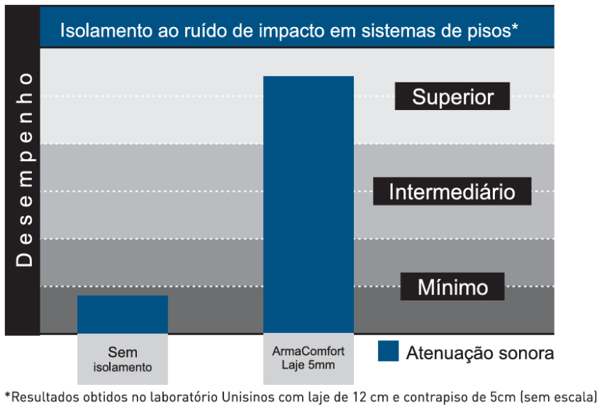 O ArmaComfort Laje atende aos critérios da ABNT NBR 15575-3 em nível superior de desempenho acústico, proporcionando eficaz atenuação da transmissão de ruídos de impacto entre pisos. É a escolha ideal para projetos que visam conforto, conformidade normativa e valorização do ambiente construído.