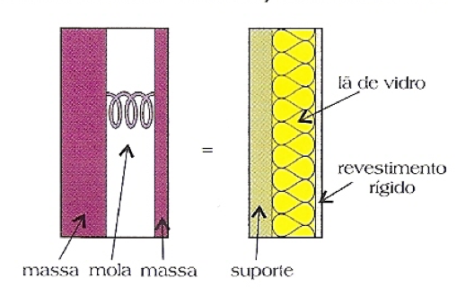 A transmissão dos sons de fora para dentro de um ambiente, ou vice-versa, ocorre entre, outra formas, através das paredes. A execução de paredes de grande massa, com grandes espessuras, e que atenuem a transmissão dos sons, limita-se pela dificuldade construtiva e se alto custo. A construção de sistemas de paredes duplas, com lã de vidro em seu interior, substitui com vantagem as paredes pesadas. Este sistema construtivo conhecido como massa-mola-massa, dificulta a transmissão dos sons graças à elasticidade da lã de vidro, impedindo a formação de ondas sonoras estacionárias em seu interior.