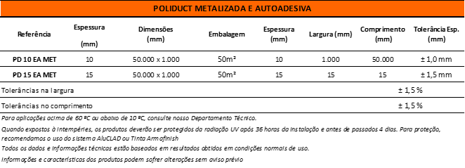 Quando expostas às intempéries, as Mantas Polipex Poliduct devem ser protegidas contra a radiação UV entre 36 horas e 4 dias após a instalação, a fim de preservar suas propriedades e desempenho. Para essa proteção, recomenda-se a aplicação dos sistemas Armaflex® AluCLAD ou Armaflex® Finish, ambos da Armacell, que garantem durabilidade e resistência em ambientes externos.