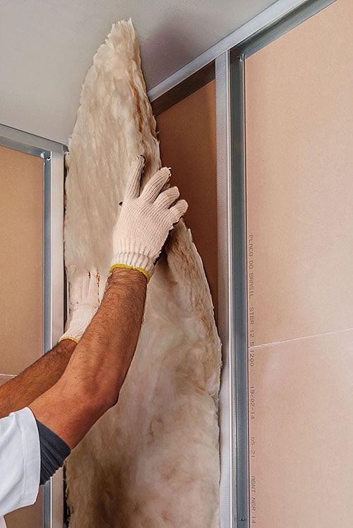 Para o correto encaixe e desempenho acústico, é indicado utilizar a lã de vidro com a espessura dos montantes metálicos.